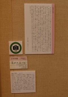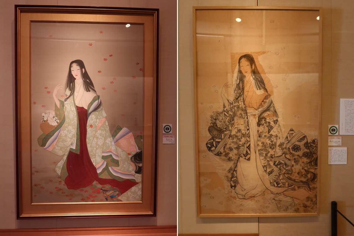 唯一写真撮影が許されていた松園の美人画の下絵(右側)と本画(左側)。何とも言えない気品に溢れた松園の美人画は、いずれも浮世絵などとは異なりスケールが大きく見ごたえ充分。下絵の筆致は勢いがあり、何度となく推敲を重ねた跡が見受けられて興味深いです。