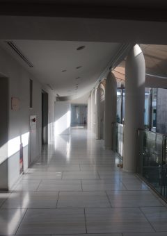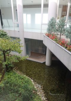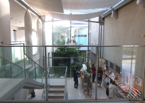 1階から地下のミュージアムショップとそれに続く池のある中庭を望みます。