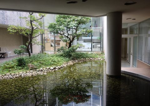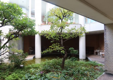 池のある中庭は、この美術館の醍醐味と言える独特の風情を持った空間で、ベンチに腰かけて、中庭を囲むガラスやレンガ、コンクリート等々、素材の対比が効いたインナーファサードや、効果的に配された樹木が、静逸な池に映りこむ様を眺めていると、しばし時の経つのを忘れてしまいます。
