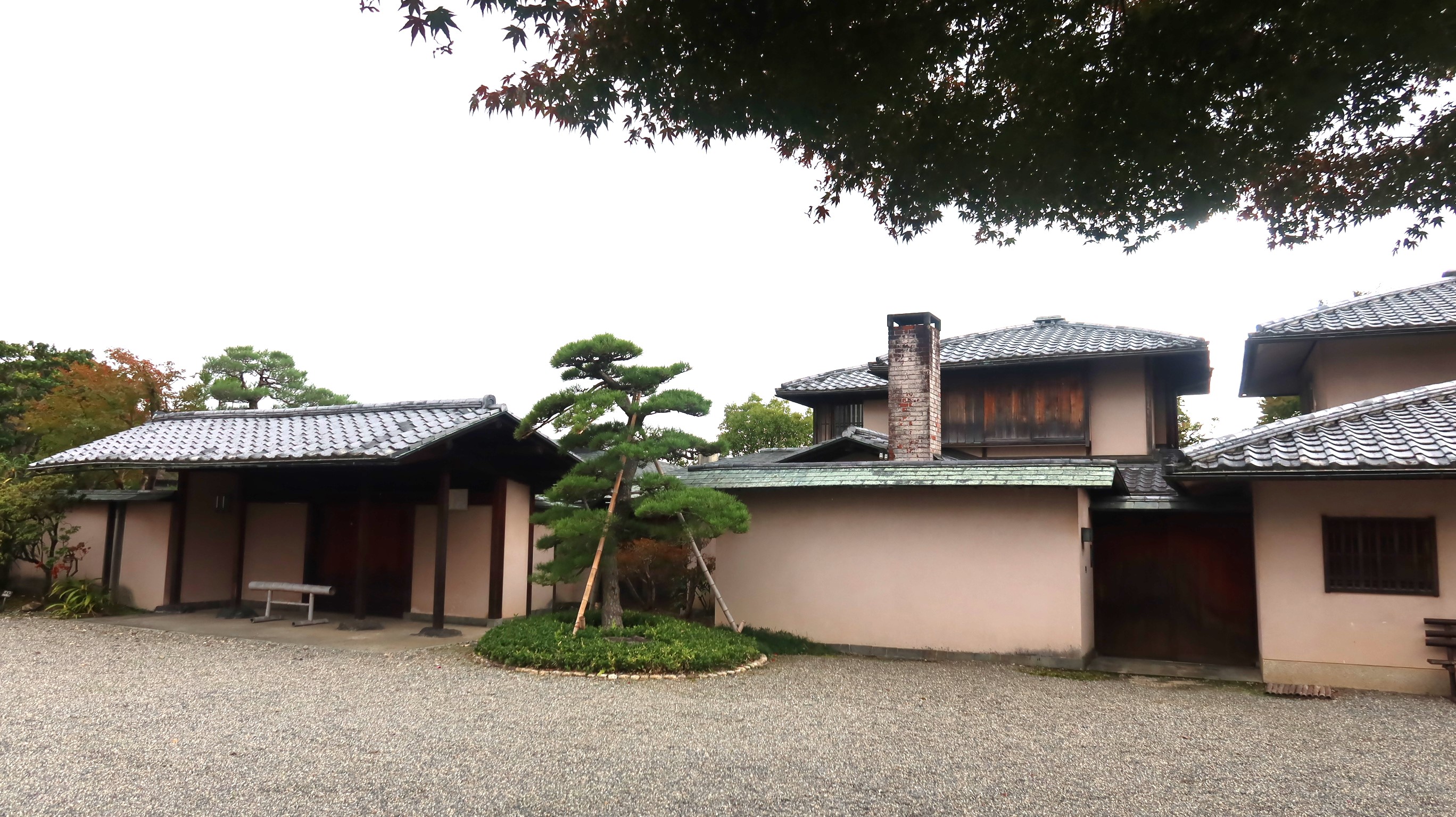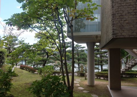 右側の庭園越しに大渕池を望みながら少し奥まった場所までアプローチ。敷地は近鉄鉄道株式会社の名誉会長の佐伯勇氏の旧邸で、同じく村野藤吾設計の和風家屋も隣接しています。