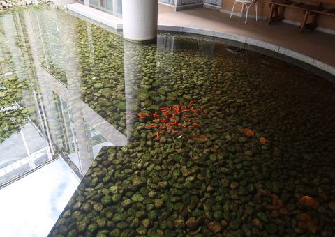 外観に突出したガラス貼の階段から、ほっと一息ついて臨める橋の架かった大渕池の景観。